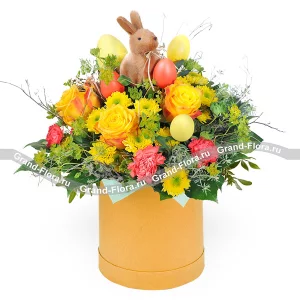 Пасхальный заяц - коробка с желтыми розами и хризантемами