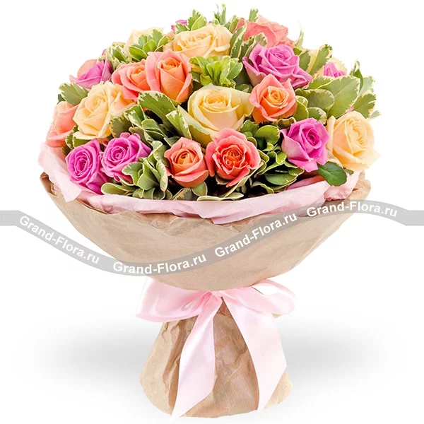 Музыка цветов - микс из разноцветных роз с декоративной зеленью
